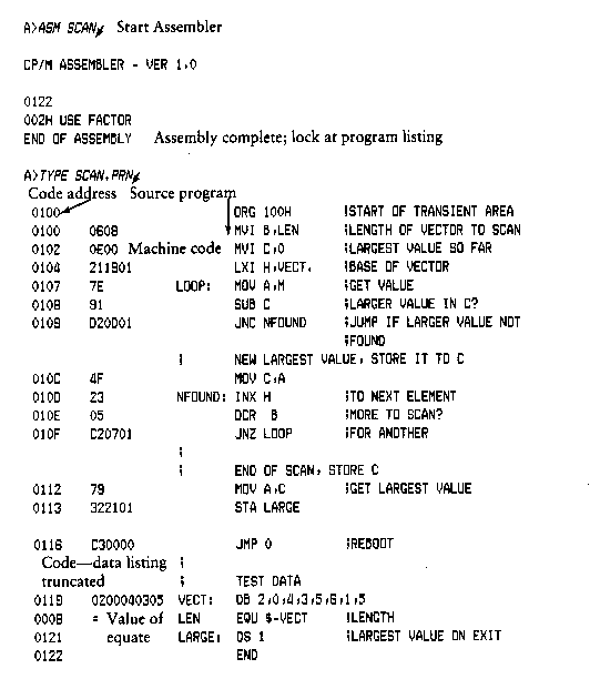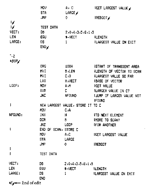 Upon completion of assembly language input, you can review the memory segment using the DDT disassembler (see the L command).