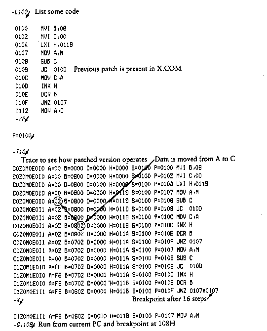 The memory image is saved as X.COM on the disk and can be directly executed by typing the name X. If further testing is required, the memory image can be recalled by typing