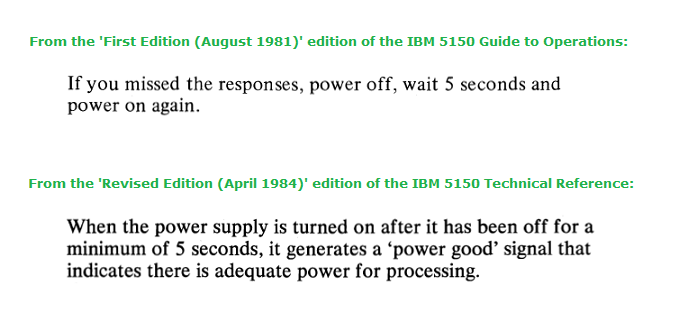 | • | After turning off the 5150's power supply, wait at least 5 seconds if you are planning to turn it back on. Any shorter; the 5150 may not start. See here. |