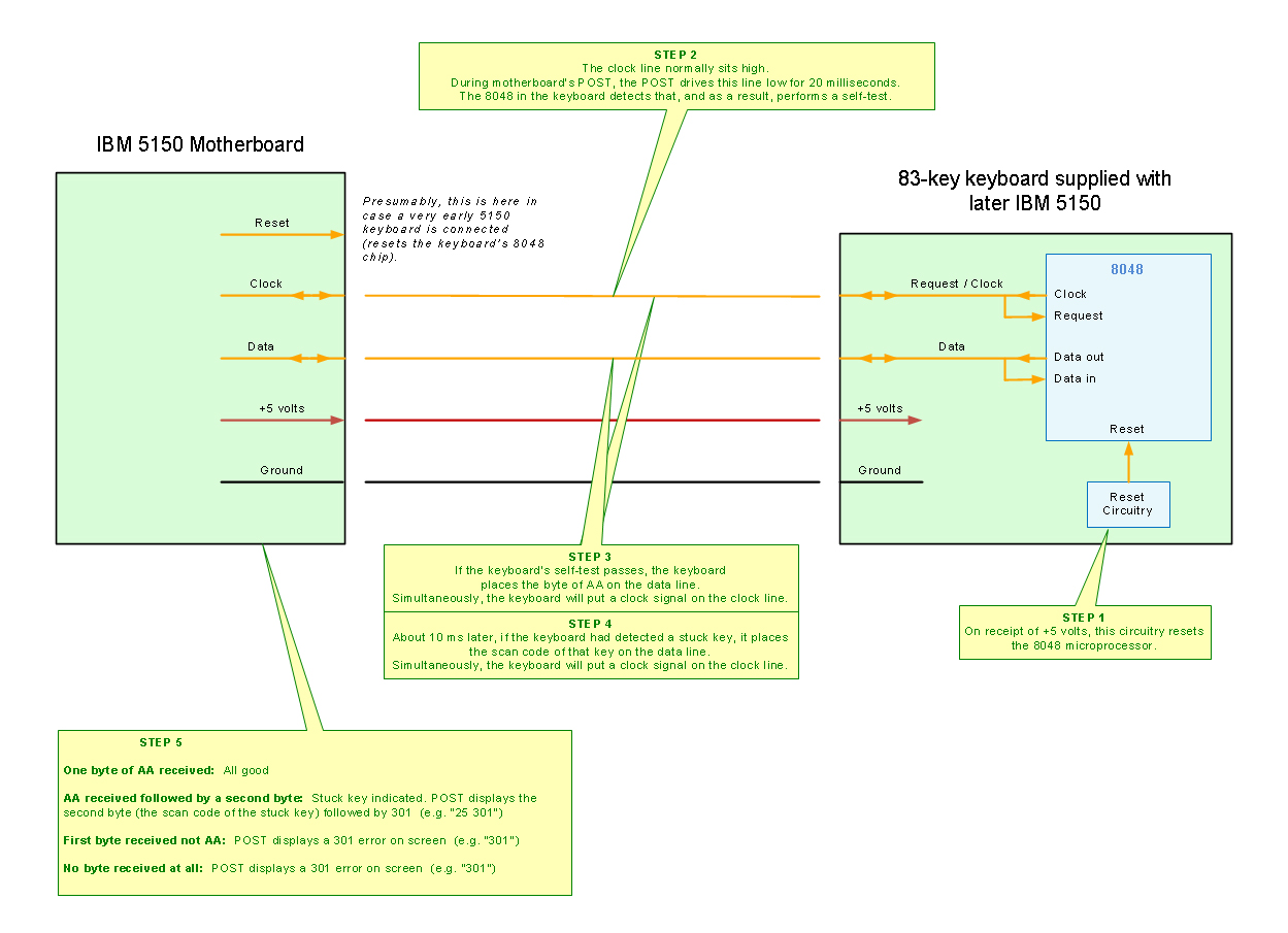 | Note 13 | If the "301" is preceeded by a byte, e.g. "23 301", then the keyboard's self test is indicating to the POST that a key is 'stuck' down. The byte indicates which key (see here). If the "301" is not preceeded by a byte, then it's a general keyboard error. Possible causes: 1. AT class keyboard attached. That will not work. A PC/XT class keyboard is required. 2. Keyboard accidentally attached to cassette connector instead of keyboard connector. 3. No keyboard attached. 4. Faulty keyboard - broken wire in cable. 5. Faulty keyboard - wire loose in connector. 6. Faulty keyboard - chip failure. 7. Faulty motherboard - bad solder joint on DIN connector for keyboard. 8. Faulty motherboard - some cases of faulty keyboard circuitry. |