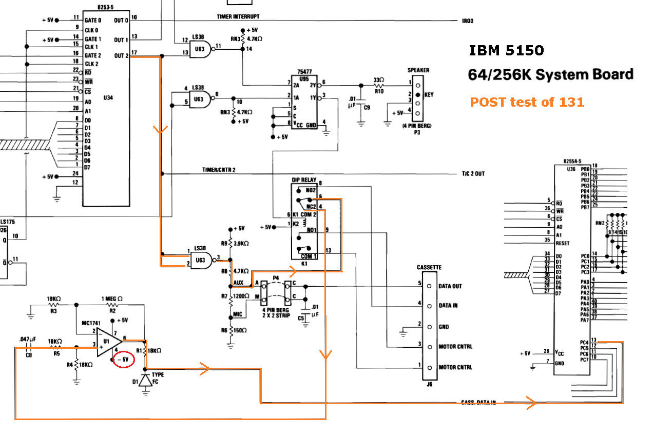 With the cassette relay (K1) in its default state of off, the POST should receive from the cassette circuitry what the POST sends to it. A diagram is here. If the test fails, display a "131" error. See note 12 for possible causes. |