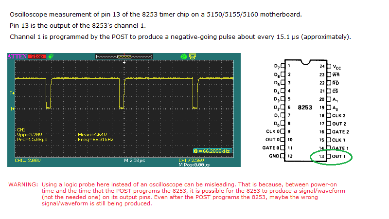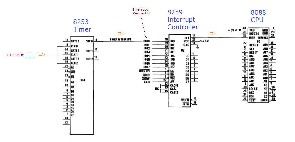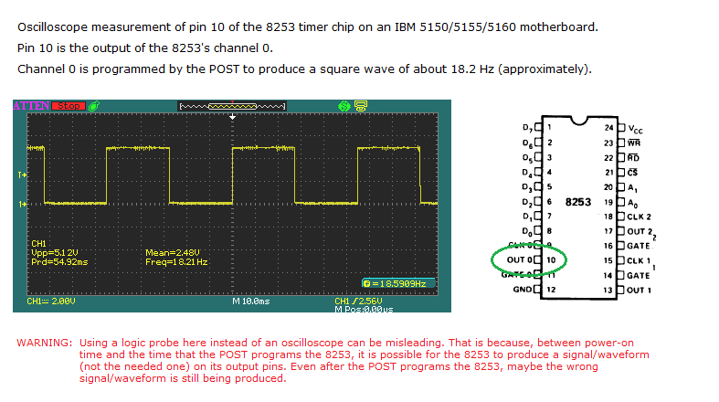 | 19 | TEST/SET TIMER 0 | Channel #0 on 8253 timer chip. This is what generates IRQ 0 (system timer). Verify that channel #0 does not count too fast or too slow. If the test fails, beep 1 long then 1 short, then halt the CPU. If the test passes, set channel #0 output to a square wave of approx. 18.2 Hz. See here and here. NOTE: The test relies on the ability of the 8259 to process IRQ 0 and the ability of the 8088 to process interrupts from the 8259. See here. |