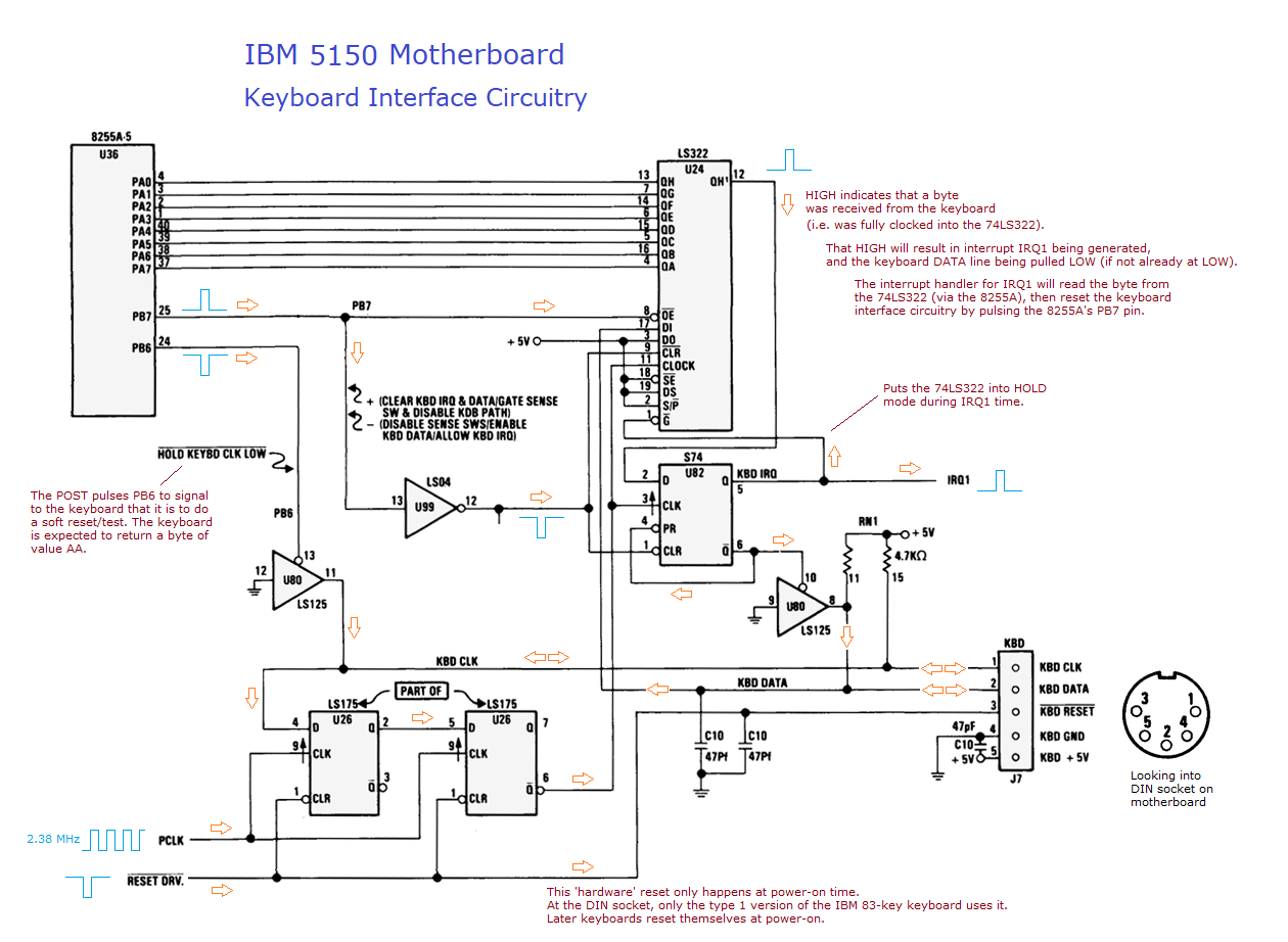 | IF REQUESTED, LOAD DIAG. CODE | If a cold boot: Take the clock pin in the motherboard's keyboard DIN connector LOW for 20 ms. (Done by the KBD_RESET subroutine.) If the attached device responds with the byte of 65h, the attached device is a special IBM device that supplies diagnostic/test code to the 5150 via the keyboard port. If 65h received, load in the diagnostic/test code (255 bytes) via the keyboard port, then execute the code. |