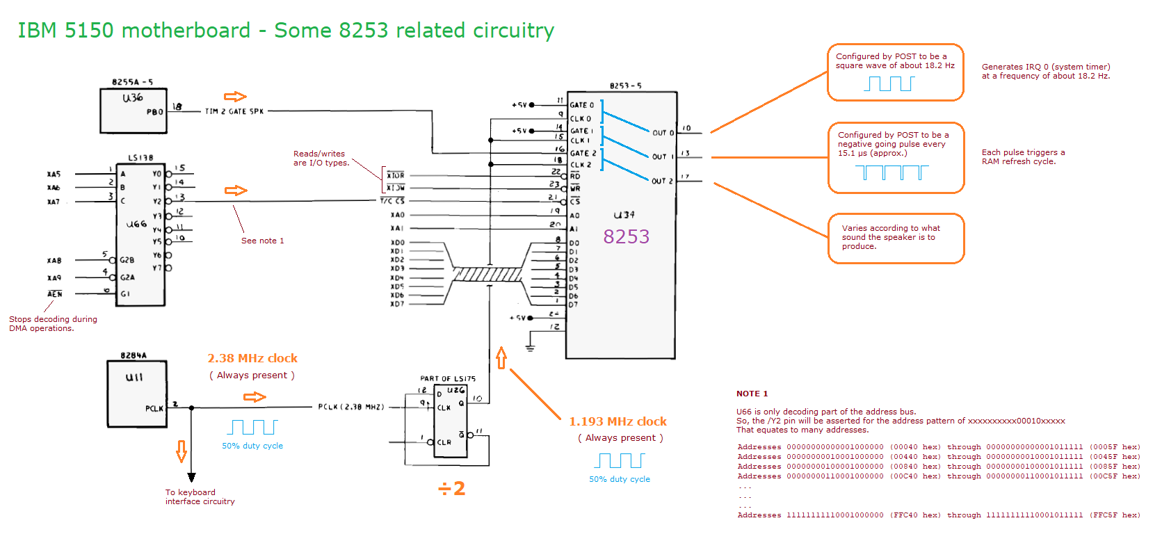 | Note 15 | Looking at the circuit diagram of the IBM 5150 motherboard: • Chip U19, a 74LS670, contains four page registers. • Page register 0 (mapped to I/O port 80h) is unused (RB and RA cannot be 0 at the same time, because /DACK2 and /DACK3 cannot be 0 at the same time) • Page register 1 (mapped to I/O port 81h) is used by DMA channel 2 (RB=0 and RA=1, because /DACK2=0 and /DACK3=1) • Page register 2 (mapped to I/O port 82h) is used by DMA channel 3 (RB=1 and RA=0, because /DACK2=1 and /DACK3=0) • Page register 3 (mapped to I/O port 83h) is used by DMA channels 0 and 1 (in both cases, RB=1 and RA=1, because /DACK2=1 and /DACK3=1) |