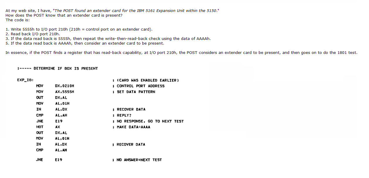 | Note 6 | This step may not actually be required because in the IBM documentation on the IBM 5161 is, "The expansion unit is automatically enabled upon power-up." But maybe the "expansion unit" in that sentence excludes the cable and extender card. This step disappears when the 01/10/86 revision of the IBM 5160 BIOS is introduced. |