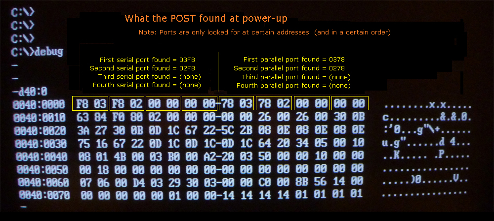 | 33 | DETERMINE COM (SERIAL) PORTS | Check for serial ports at the following I/O addresses, in that order: 3F8, 2F8 When a port is found, put the base address of the port into the BIOS Data Area (see here). |