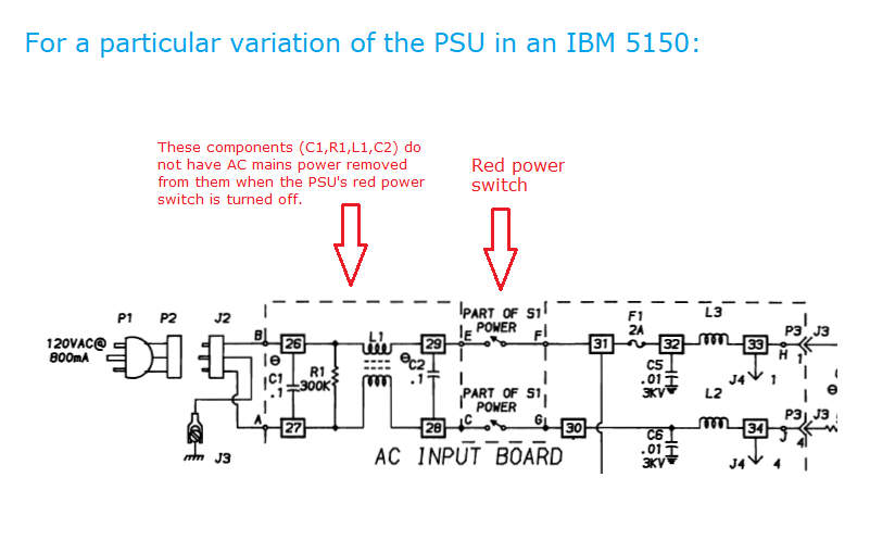 Turning off the power supply's big red switch does not remove AC mains (house) voltage from all components within the power supply. (Example)