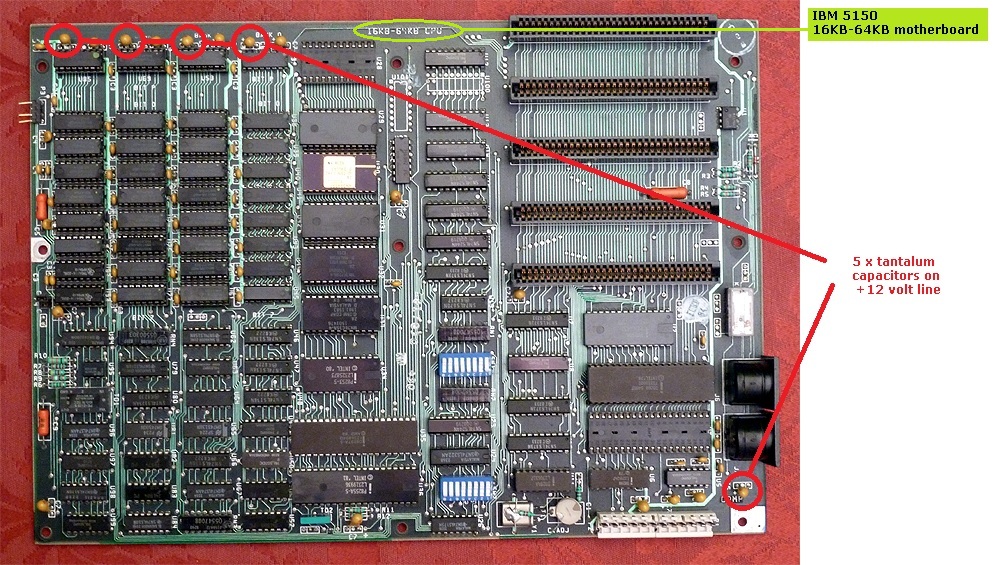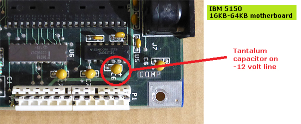 On this motherboard, there are many components on the +12 volt line. Those components are five tantalum capacitors, and all of the RAM chips (type 4116). Click here to see a photo of the five tantalum capacitors. On this motherboard, if any of the tantalum capacitors on the +12 volt line are faulty, then they will later need to be replaced, otherwise RAM operation is compromised. Going forward, in turn, remove each of the five capacitors, either by desoldering, or by using a pair of sidecutters to cut the capacitor off the board. If you have little soldering experience, then perhaps (if possible) use the technique shown at here, because on a 5150 motherboard, soldering the ground and/or power lines on the PCB is problematic, and your inexperience could end up damaging the PCB. After each removal, see if the power supply's fan turns when plug P8 from the power supply is plugged in. ..................