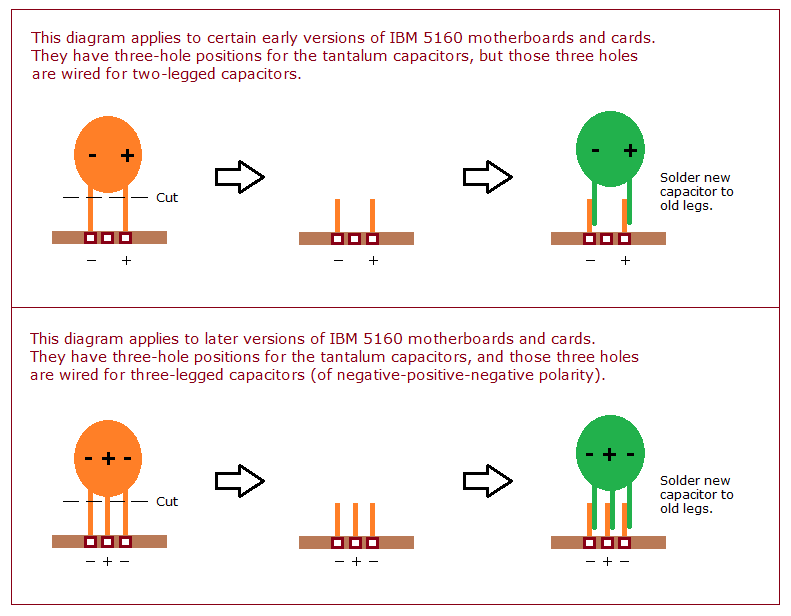 As stated earlier, on this type of IBM 5160 motherboard, the two subject capacitors are not critical to the operation of the motherboard.
