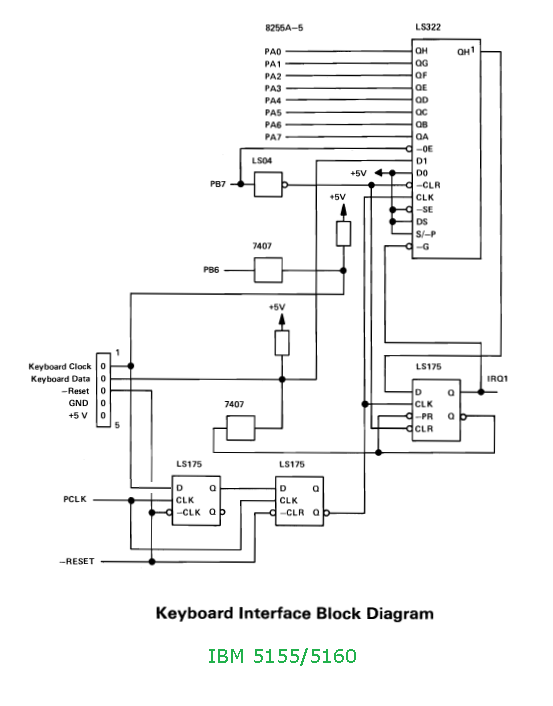 The 5155 motherboard does not have a keyboard controller chip. Instead, it uses discrete components - see here. |
