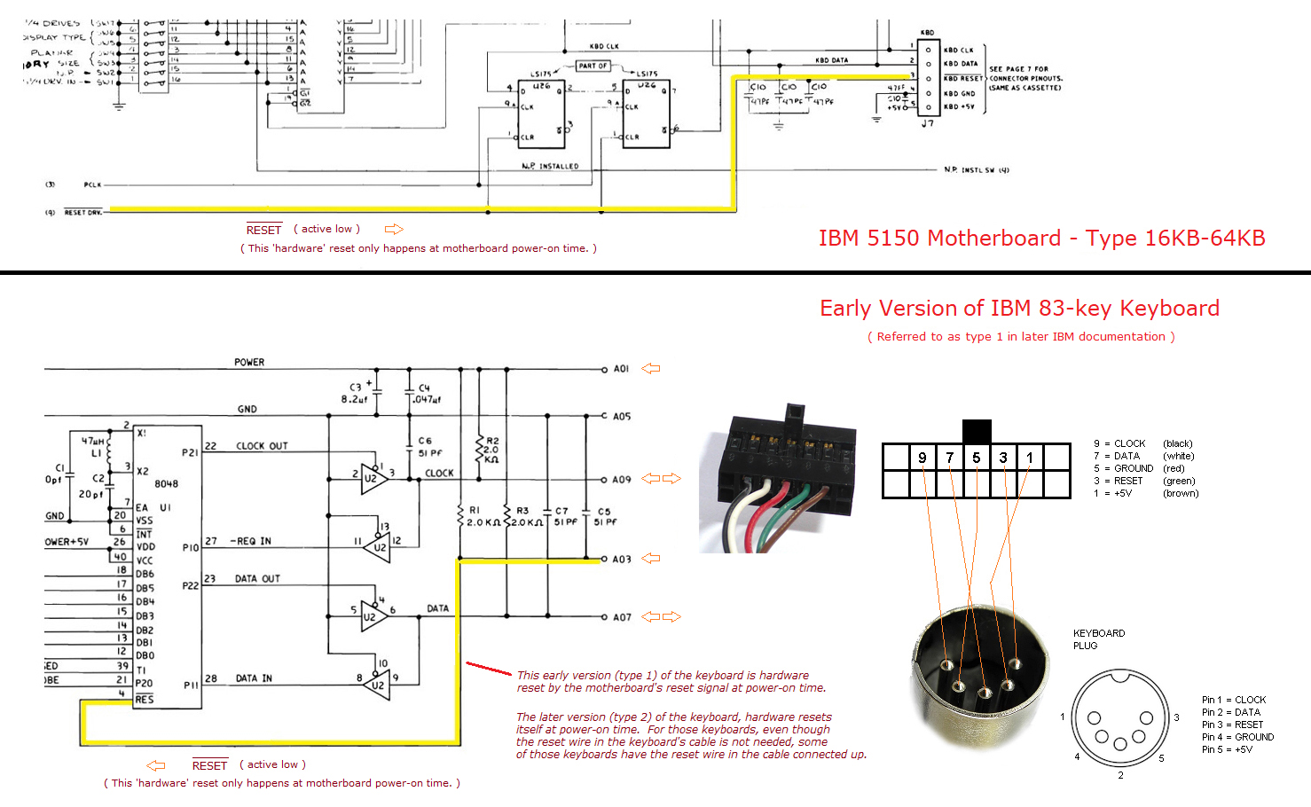 The same later documentation refers to two types of this 83-key keyboard; type 1 and type 2. At power-on time, the type 1 keyboard is reset by the motherboard (diagram here), whereas the type 2 keyboard resets itself. Both types will work with an IBM 5160.