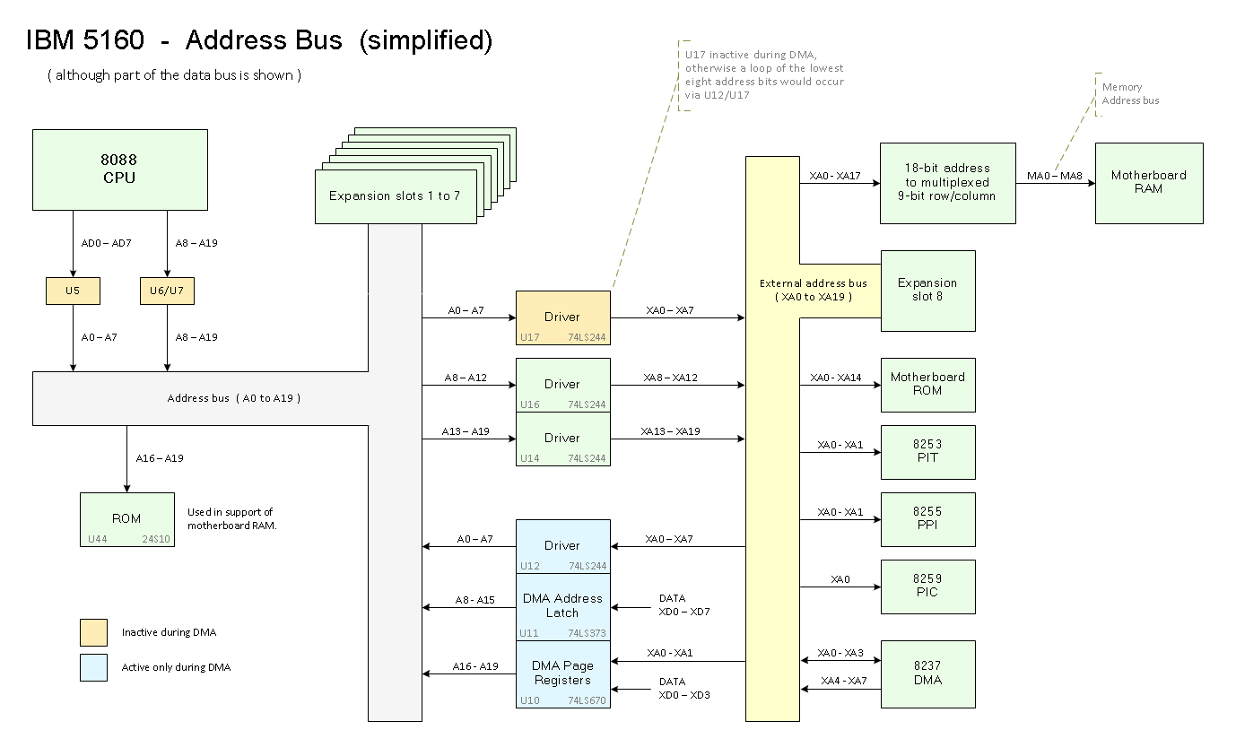 I used to think that slot 8 was a special slot created for the 'extender card', a card required to connect an IBM 5161 expansion unit to the IBM 5160. However, one piece of evidence that it is not, is on page XVIII of the March 1986 edition of the 5155/5160 Technical Reference. That page is for the IBM 5155 (IBM Portable Computer), a computer that contains a 5160 motherboard, and shows the extender card in slot 2. There is evidence elsewhere. For example, the extender card is compatible with the IBM 5150 (later models), a machine that does not have an equivalent of the 5160's slot 8.