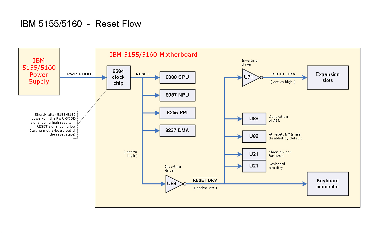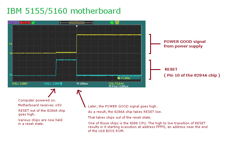 | 4. | Because the POWER GOOD signal is low, the motherboard's 8284A chip takes the motherboard's RESET line high. Per here, various chips on the motherboard (including the 8088 CPU) are held in a reset state. |