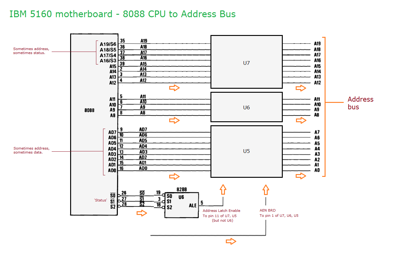 Basically (repeat: basically), the read of address FFFF0 goes something like: - 8088 starts a 'Code Access' bus transaction. - 8088 sets its three status pins (see here) to indicate to the 8288 chip that a 'Code Access' bus transaction is in progress. - The 8288 chip, seeing the 8088 indicate a status of 'Bus Access', asserts its /MRDC output pin. - - Per here and here, the 8088, the 8288, and certain circuitry, puts address FFFF0 onto the address bus. - The address is then put onto the external address bus by driver chips U14/U16/U17. - The 15 address pins of ROM chip U18, which are on the external address bus, see address 7FF0 (the low 15 bits of address FFFF0). - - Certain circuitry establishes that motherboard address FFFF0 corresponds to ROM chip U18, and accordingly, drops the /CS pin (/CE pin) on ROM chip U18. See here and here. - As a result, ROM chip U18 outputs the data it has at its 7FF0 address onto the external data bus. - Certain circuitry instructs U15 to put that data from the external data bus onto the data bus. - Per here, the 8088 reads the data bus. BTW. If you have a logic probe, you can see that for yourself via the procedure at here. |