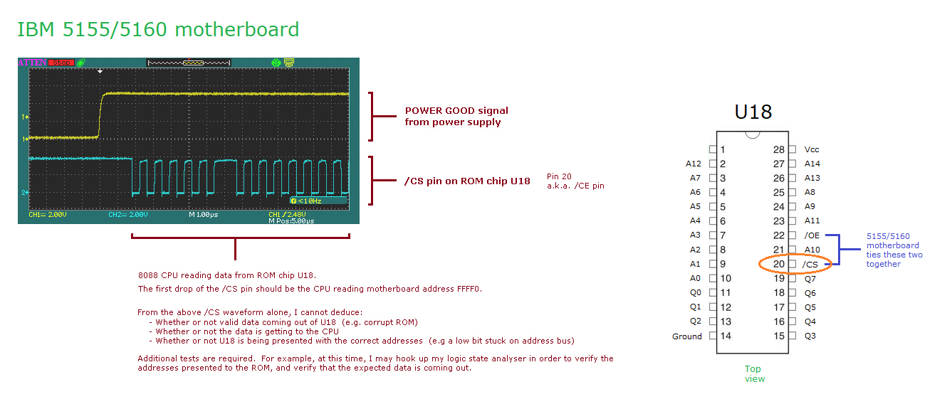 | 8. | When the 8088 CPU leaves the reset state (see note 1 below), it starts execution at address FFFF0. In the IBM 5160, that address corresponds to an address near the end of motherboard ROM chip U18, one of the motherboard's two BIOS ROM chips (per here). |