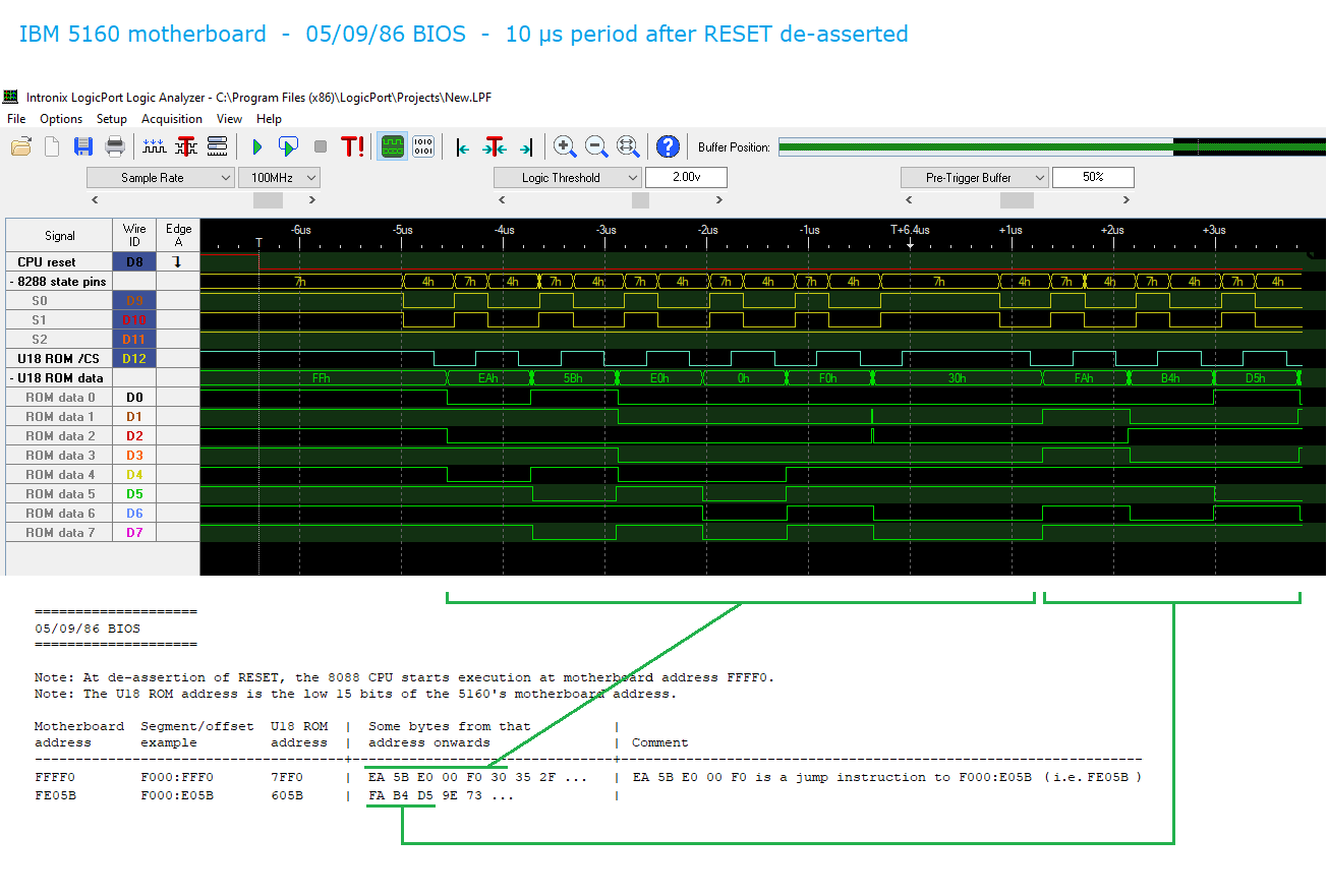 | 9. | Starting at ROM chip U18's address of 7FF0, are five bytes, which together form a jump instruction to the start of the BIOS' power-on self test (POST). At here is a capture of that via a logic analyser. |