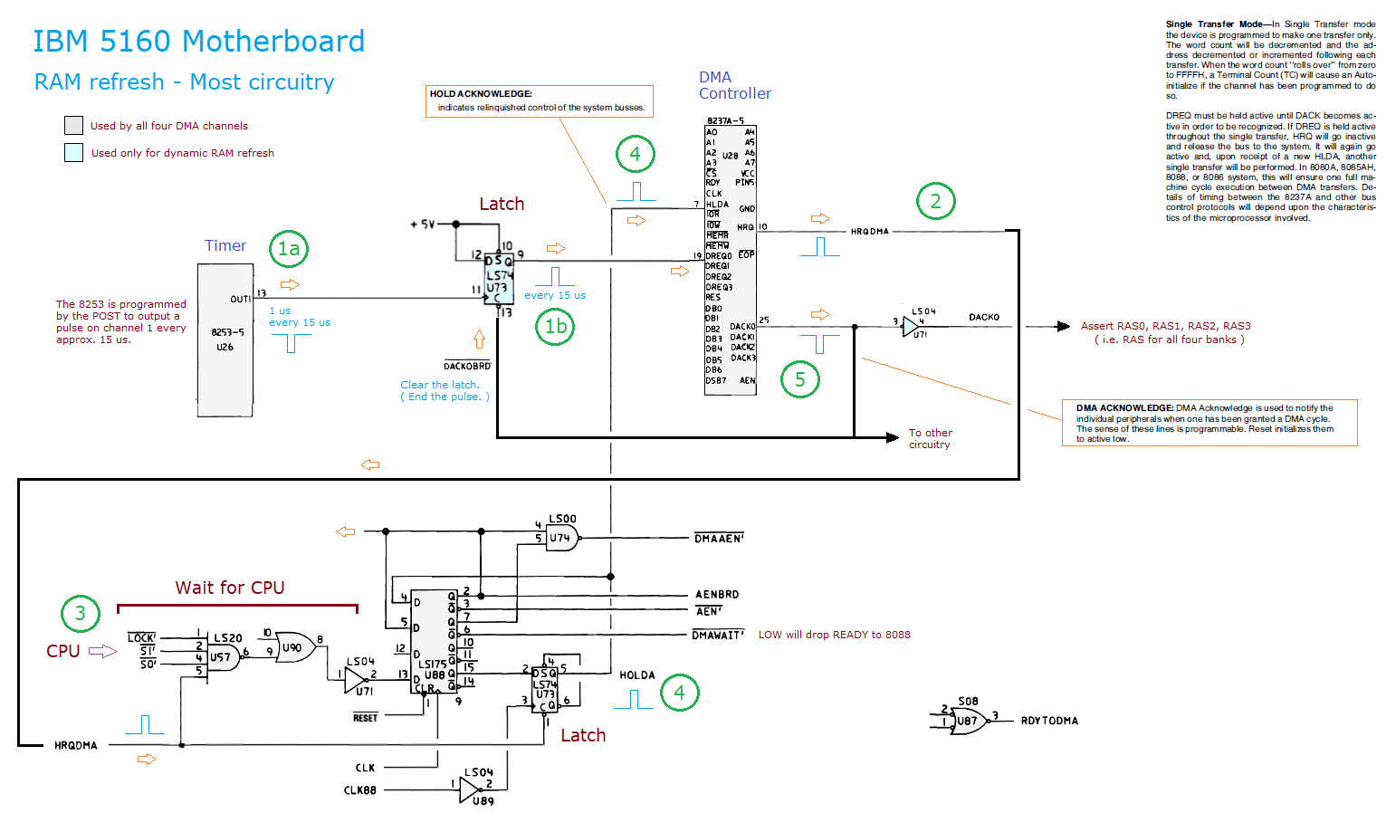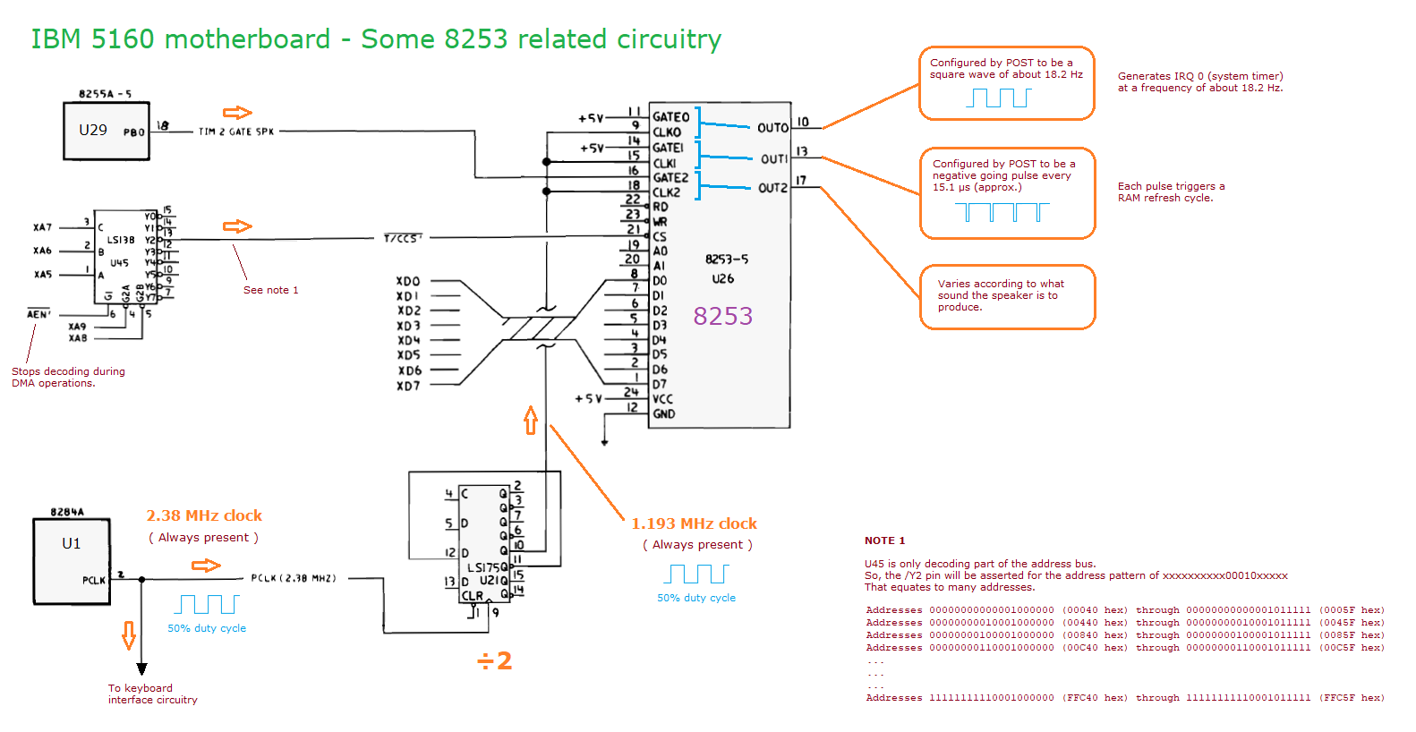 | Note 16 | Looking at the circuit diagram of the IBM 5160 motherboard: • Chip U10, a 74LS670, contains four page registers. • Page register 0 (mapped to port 80h) is unused (RB and RA cannot be 0 at the same time, because /DACK2 and /DACK3 cannot be 0 at the same time) • Page register 1 (mapped to port 81h) is used by DMA channel 2 (RB=0 and RA=1, because /DACK2=0 and /DACK3=1) • Page register 2 (mapped to port 82h) is used by DMA channel 3 (RB=1 and RA=0, because /DACK2=1 and /DACK3=0) • Page register 3 (mapped to port 83h) is used by DMA channels 0 and 1 (in both cases, RB=1 and RA=1, because /DACK2=1 and /DACK3=1) |