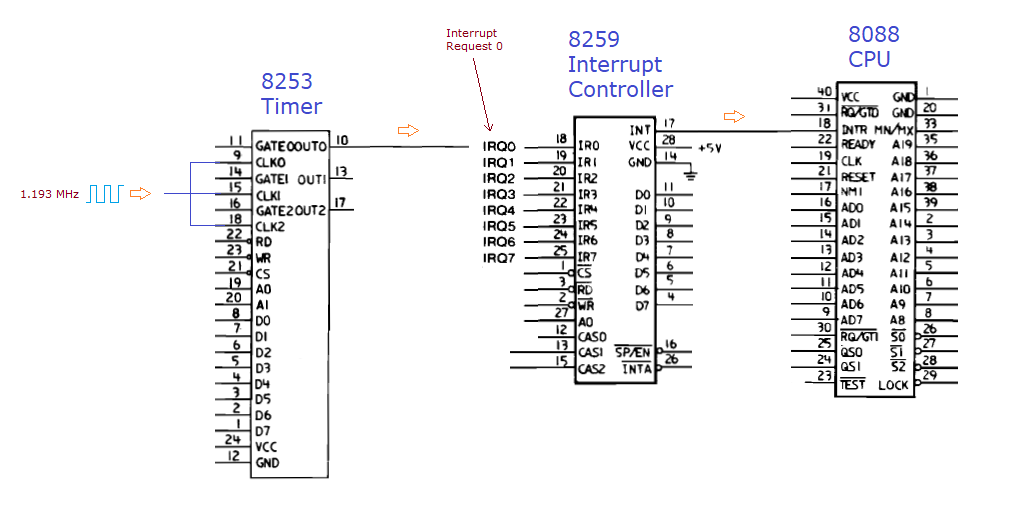| 23 | TEST/SET TIMER 0 | Channel #0 on 8253 timer chip. This is what generates IRQ 0 (system timer). If the test fails, display a "101" error then halt the CPU. If the test passes, set channel #0 output to a square wave of approx. 18.2 Hz. See here and here. NOTE: The test relies on the ability of the 8259 to process IRQ 0 and the ability of the 8088 to process interrupts from the 8259. See here. NOTE: The 101 error can also be generated by two other tests - See test '8259 TEST' and test 'DMA TC0'. |