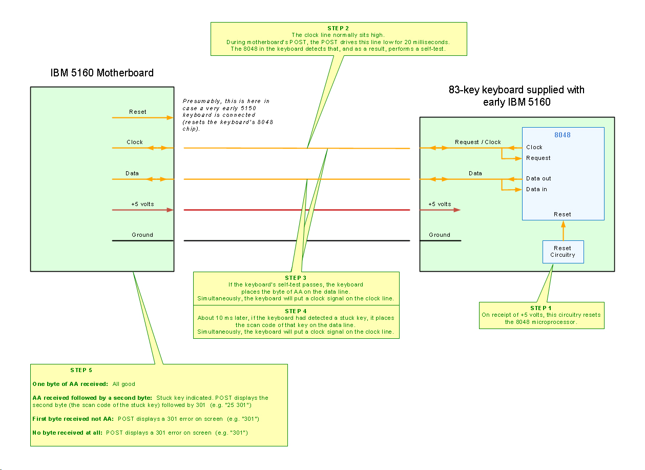 Keyboard related error. If the "301" is preceded by a byte, e.g. "23 301", then the keyboard's self test is indicating to the POST that a key is 'stuck' down. The byte indicates which key (see here). If the "301" is not preceded by a byte, then it's a general keyboard error. Possible causes: • No keyboard attached. • AT class keyboard attached. That will not work. A PC/XT class keyboard is required. • Faulty keyboard - broken wire in cable. • Faulty keyboard - wire loose in connector. • Faulty keyboard - chip failure. • Faulty motherboard - bad solder joint on DIN connector for keyboard. • Faulty motherboard - some cases of faulty keyboard circuitry. A related diagram is at here. |