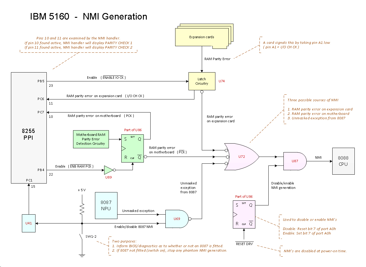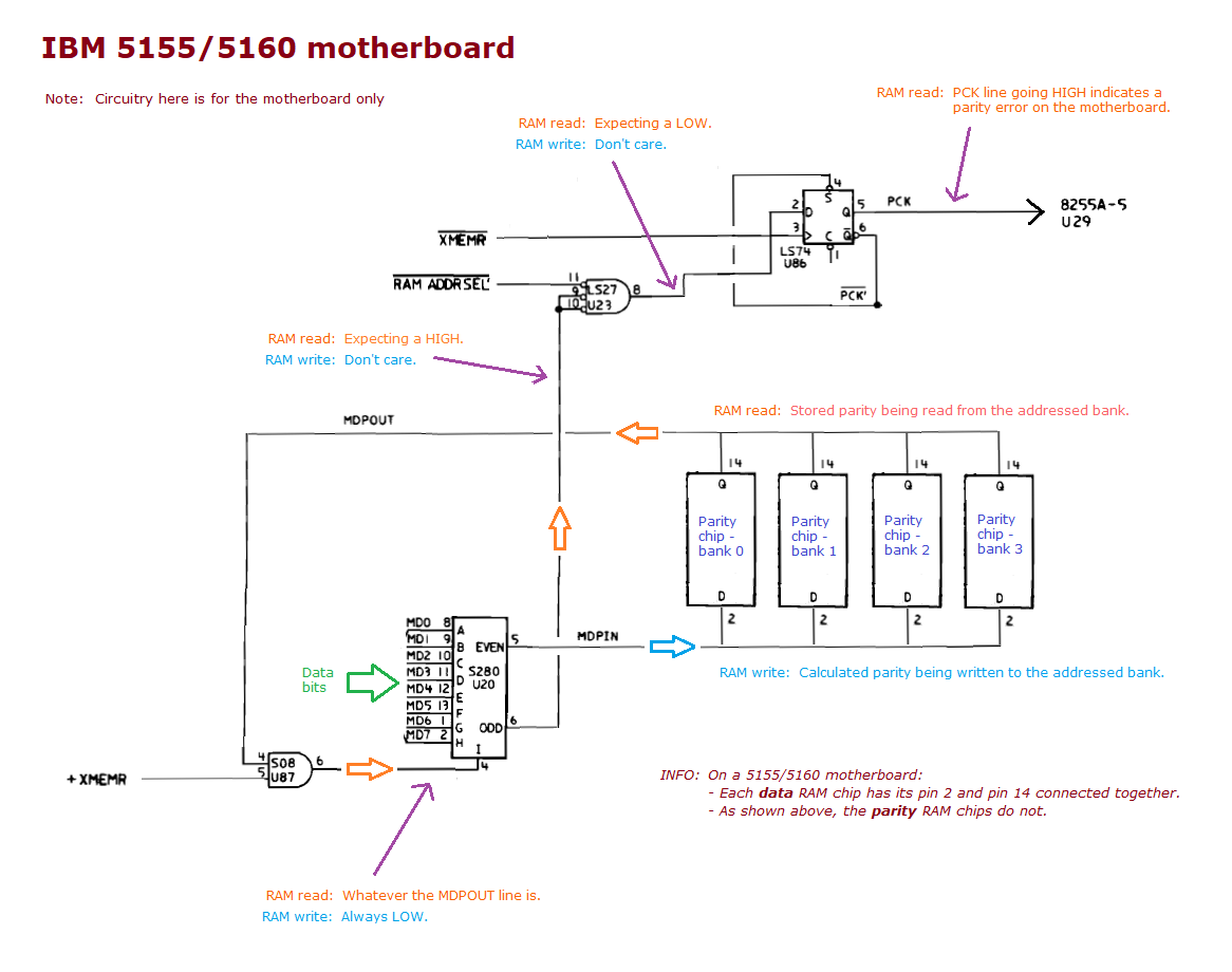 | PARITY CHECK 1 displayed on-screen | A parity error occurred when an address in motherboard RAM was read. (The '1' indicates motherboard.) Related diagram at here. Most likely causes: • 5160 motherboard - RAM chip failure. • 5160 motherboard - A RAM chip (possibly multiple) has a poor connection to the motherboard. Some other possible causes: • 5160 motherboard - Bad RAM refresh circuitry. • 5160 motherboard - Bad parity generation circuitry. • 5160 motherboard - Bad filter capacitor/s close to the RAM chips. (Of those, suspect the tantalum type ones before the ceramic type ones.) • If intermittent, see note 2. |