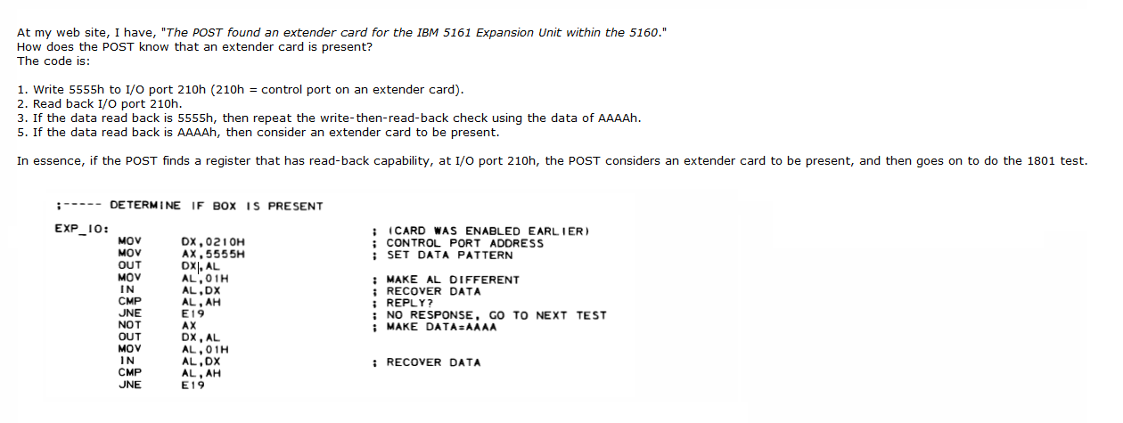 | 1801 displayed on-screen | The POST found an extender card for the IBM 5161 Expansion Unit within the 5160. Because of that, the POST made an assumption that a 5161 Expansion Unit is connected to the card. The POST attempted to communicate with the 5161 and that communication failed. Related diagrams at here and here. Some possible 1801 causes: • 5161 Expansion Unit - not connected to the extender card in the host computer (e.g. missing cable) (e.g. loosely connected cable). • 5161 Expansion Unit - not powered on (should to be powered on before the host computer is). • 5161 Expansion Unit - faulty system board (backplane). • 5161 Expansion Unit - power supply - faulty. • 5161 Expansion Unit - power supply - has shut down due to a fault elsewhere in the 5161. • 5161 Expansion Unit - power supply - has shut down due to inadequate loading. • Cable - faulty. • Cable - oxide build-up on the contacts within the two connectors. • Extender card - faulty. • Extender card - not seated correctly in host computer's ISA slot, or poor connection (e.g. dirty contacts). • Extender card - oxide build-up on the contacts within the cable connector. • Receiver card (within 5161) - wrong type. See here for a photo of the correct type. • Receiver card (within 5161) - faulty. • Receiver card (within 5161) - not seated correctly in 5161's ISA slot, or poor connection (e.g. dirty contacts). • Receiver card (within 5161) - oxide build-up on the contacts within the cable connector.