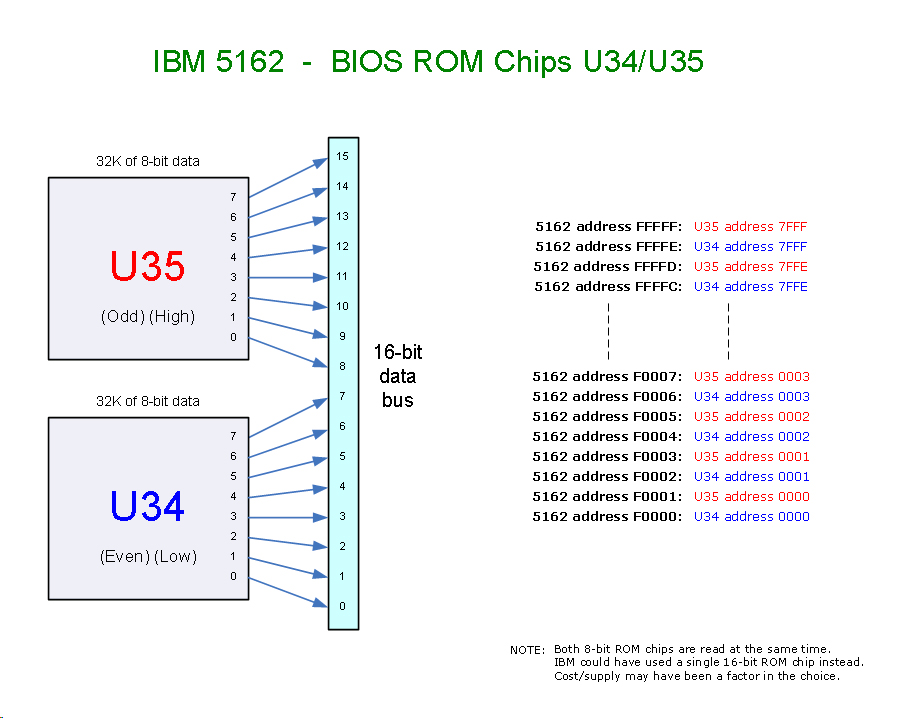 They are two 8-bit chips which, in combination, supply 16 bits to the IBM 5162's 16-bit data bus. Of the pair, U34 is the EVEN/LOW chip and U35 is the ODD/HIGH chip. Diagram here.