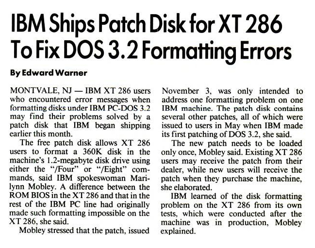 "IBM ships patch disk for XT 286 to fix DOS 3.2 formatting errors."