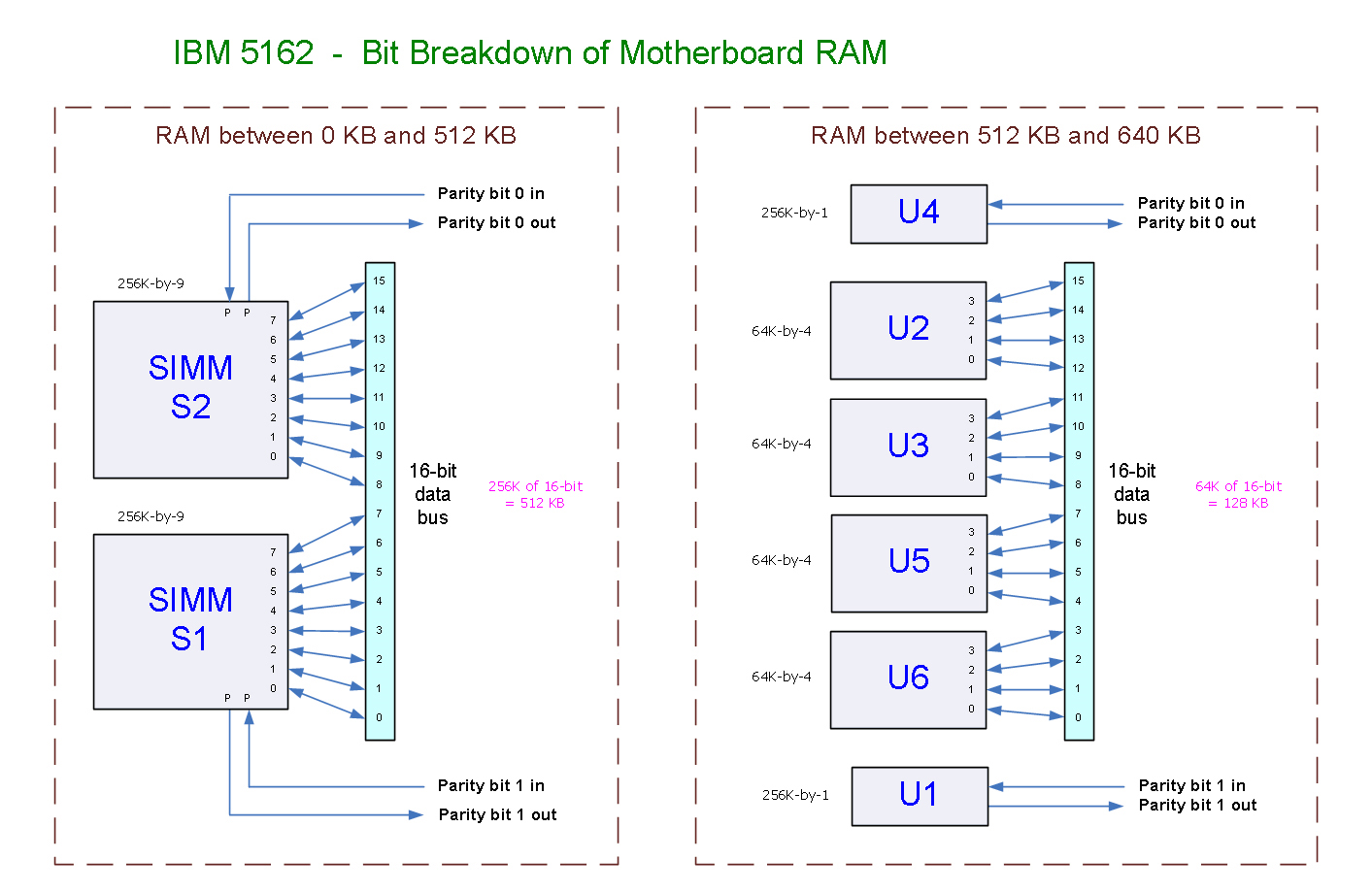 | • | In the 5162, conventional memory addressed 0 KB to 512 KB, resides on the motherboard in SIMM's S1 and S2. - A location diagram is here. - A diagram showing bit breakdown is here. - Both SIMMs need to be present. - According to here, in the 5162, "industry-standard 30-pin, of 256KB, with parity, of 150ns access time (or faster), of 256cycle/4ms refresh", should work as a substitute to what was fitted by IBM. - If either SIMM fails, the symptoms presented depend on the type of video card fitted: * MDA or CGA card: You will see a 201 error which points to address 000000. * Other: No visual nor audible indication. A POST card will reveal the situation (per here). |