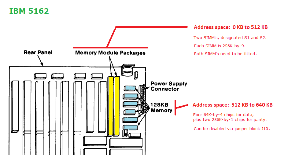 | • | In the 5162, conventional memory addressed 512 KB to 640 KB, resides on the motherboard in the six RAM chips adjacent to the power connector. - A location diagram is here. - A diagram showing bit breakdown is here. - If required, this memory can be disabled via jumper block J10. |