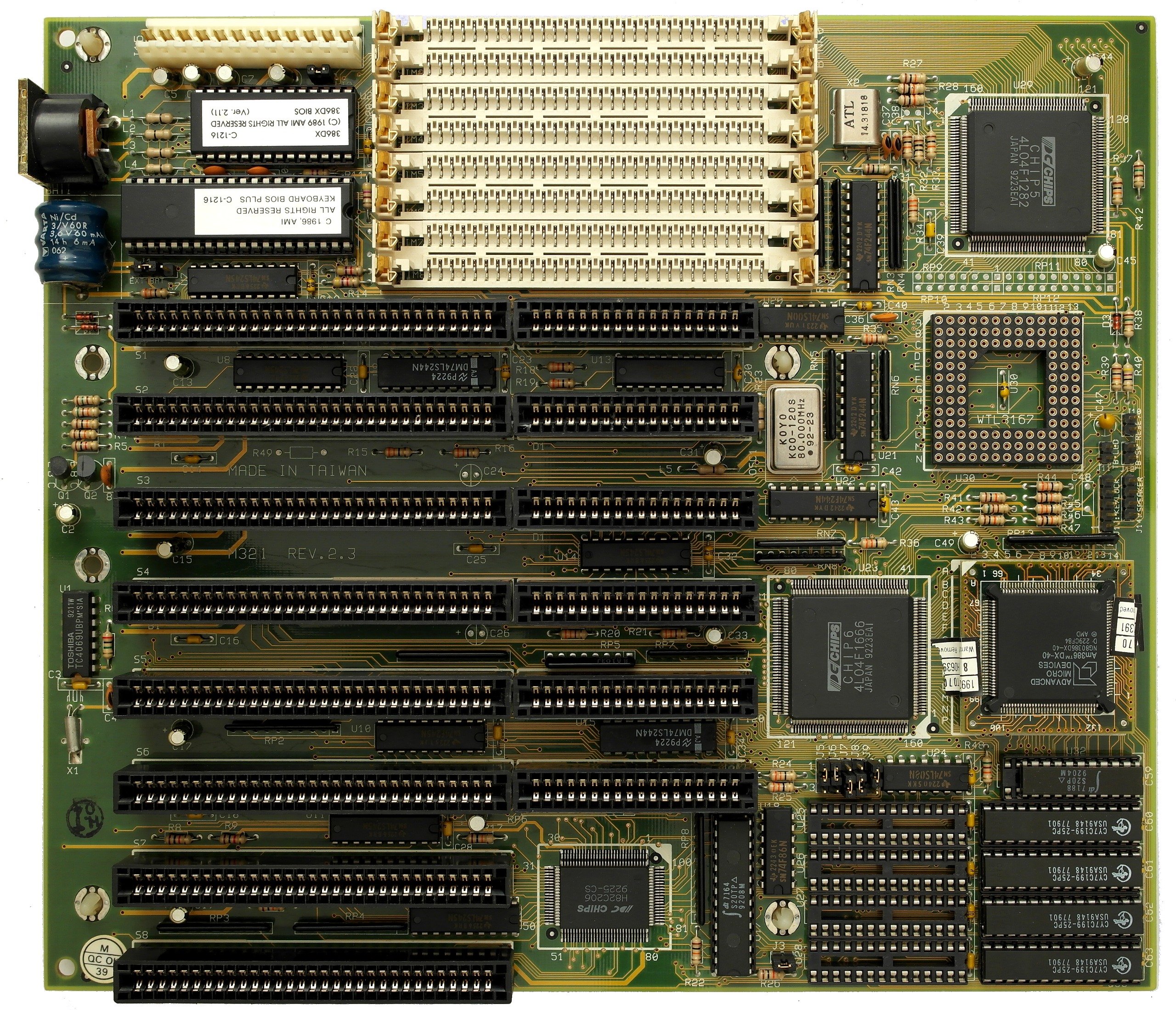 | Motherboard chipset | 8 chips by Chips & Technologies: P82C206, P82C301C, P82C302C, P82A303, P82A304, P82B305 (qty 2), P82A306A |