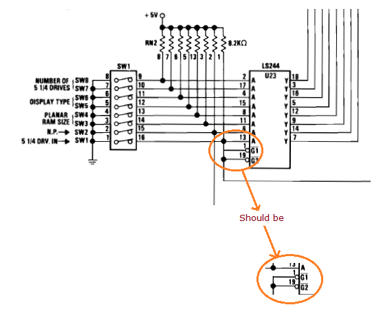 | Error | The signal coming into pin 10 of U57 is labeled as "MEMR". That is incorrect. The signal is YMEMR (which is MEMR that has been suitably delayed). |