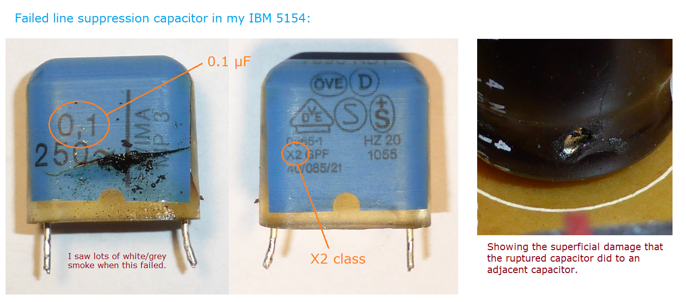 For RIFA made capacitors like this one, the rupture is accompanied by smoke and a strong foul odour. The odour will persist until the capacitor is removed. The capacitor contains fluid, which may leak out. Do not touch the fluid (it may be toxic). The "X" in "0,1µF@X" probably indicates that this capacitor is of class X. |