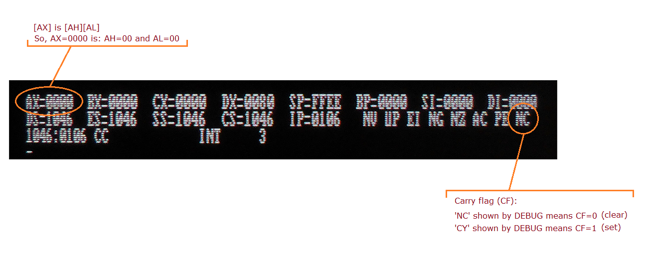 Shortly after you type in the G=80, the code will finish executing, then DEBUG will list the registers and flags of the CPU. As shown at here, verify that the AH register contains 00 (AL is unimportant) and that you see "NC". Those two present is the BIOS indicating that the 'read sector' operation was successful. |