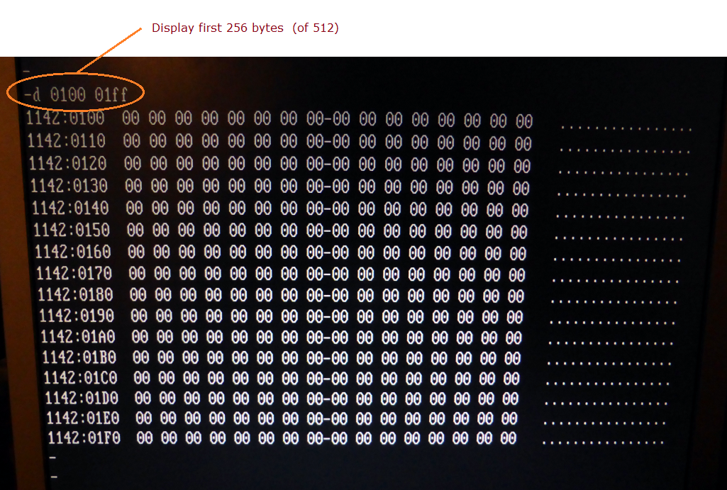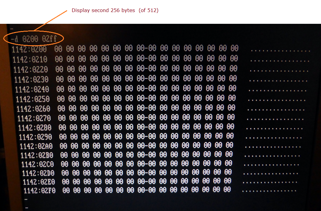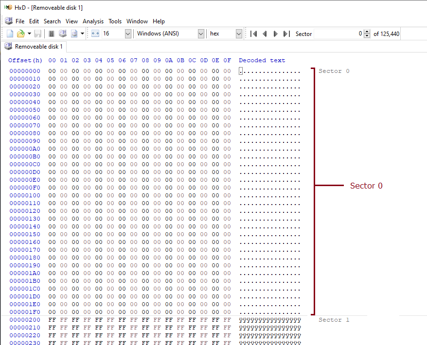 Verify that all bytes in the displayed 'sector 0' are zero (00), as shown at here. |