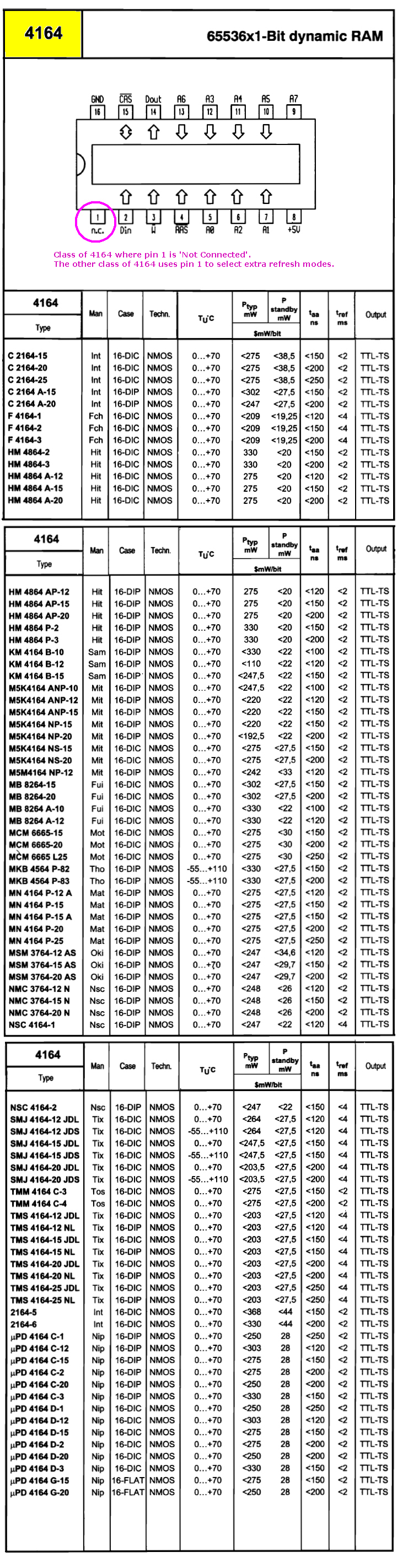 | National Semiconductor | NMC4164-1 | 120 ns | NMOS | N.C. | 256cycle/4ms | 4164 list 1 | 4164 list 3 | Probable error in list #3: "NSC4164" should be "NMC4164" | |||
