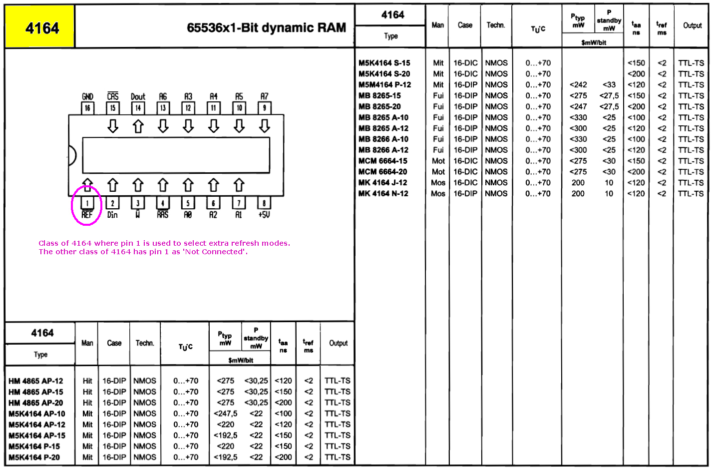 | Oki | MSM3764-2 | ? | NMOS | ? | ? | 4164 list 2 | Pin 1 use unknown, however, inclusion on list#2 suggests N.C. | ||||