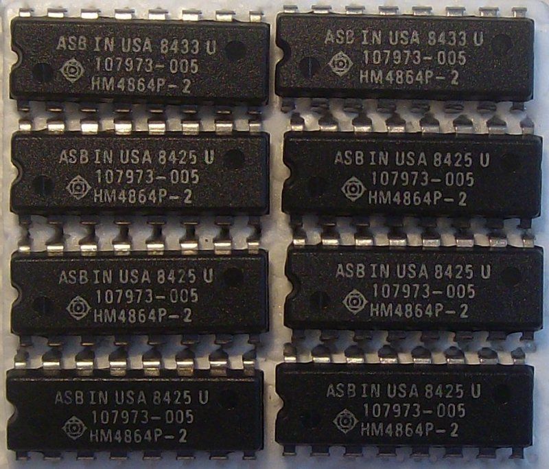 | Texas Instruments | TMS4164-20 | 200 ns | NMOS | N.C. | 256cycle/4ms | photo | 4164 list 1 | 4164 list 2 | 4164 list 3 | datasheet | Photo is of a unit within a late IBM 5150 |