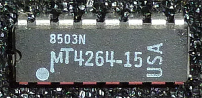 | Micron | MT4264-15 | 150 ns | NMOS | N.C. | 256cycle/4ms | photo | 4164 list 1 | datasheet | Datasheet indicates an additional marking of 'C' for the ceramic version. | ||