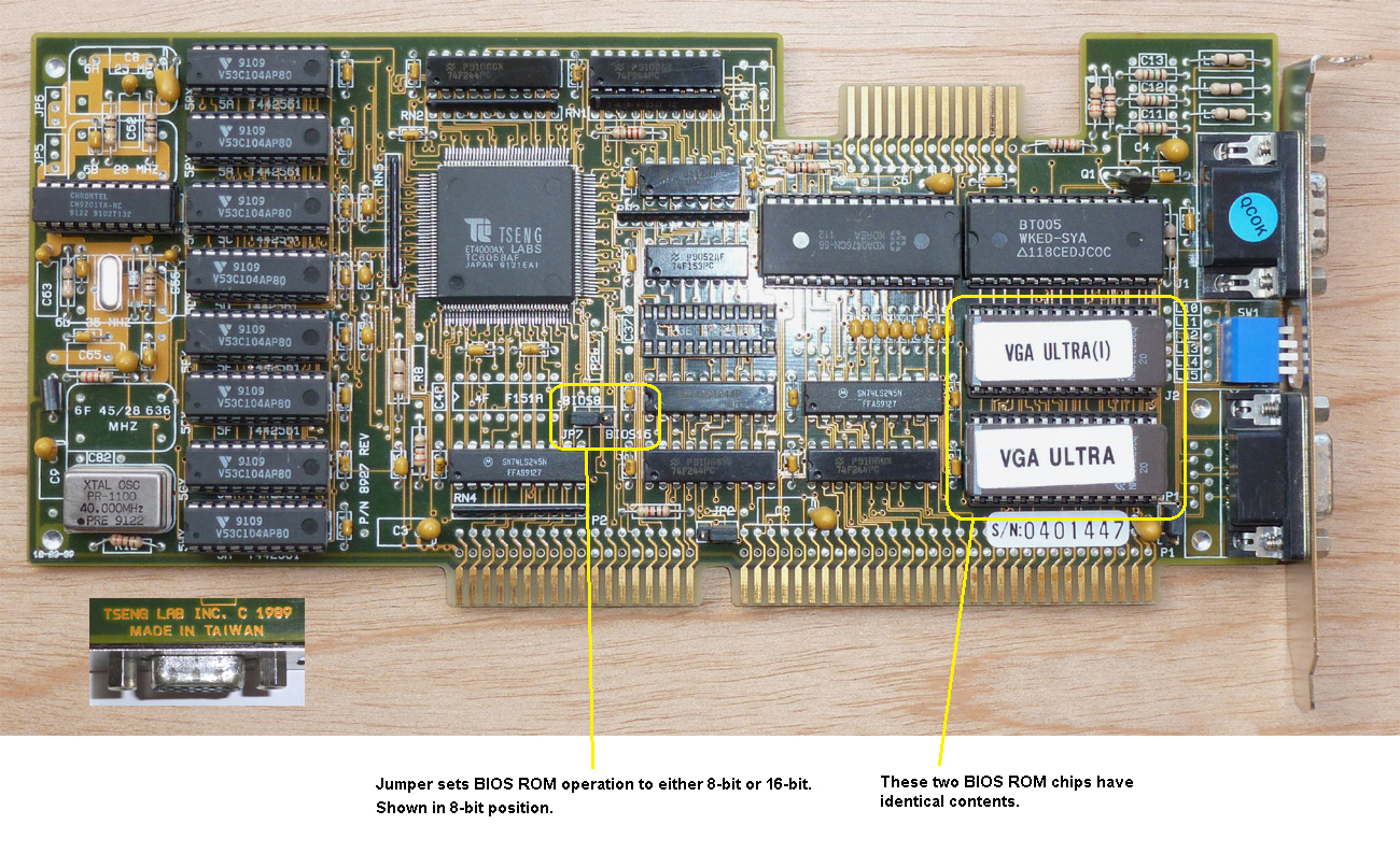 | Tseng Labs | ??? | 8-bit VGA card | '89 | 8.01 | ? | BIOS | 00114E | [27C256] | 32 KB | D | fikus8 | Download | Contains "02/23/89 V8.01X" and "(c)1988 Tseng Laboratories, Inc." |