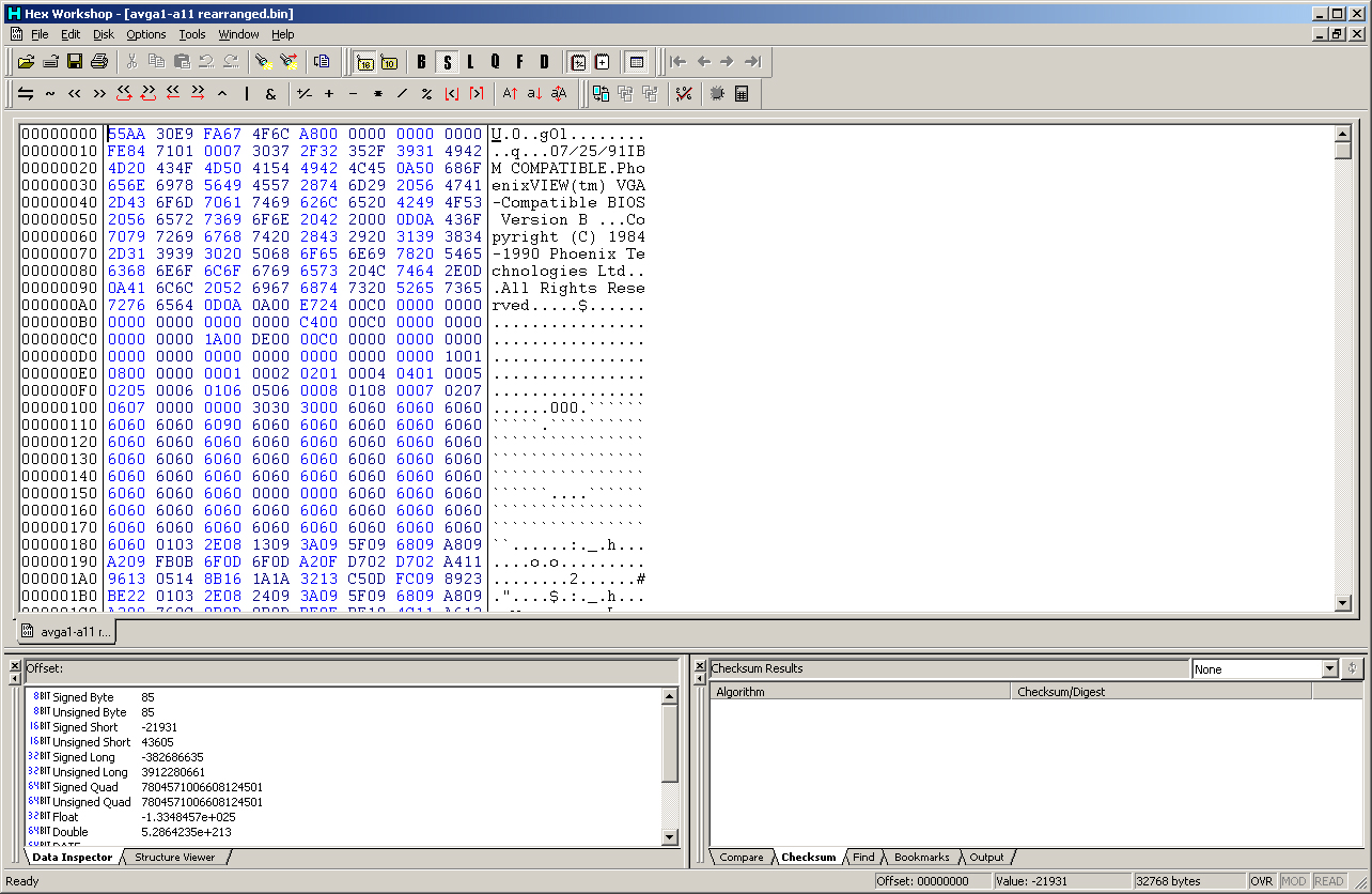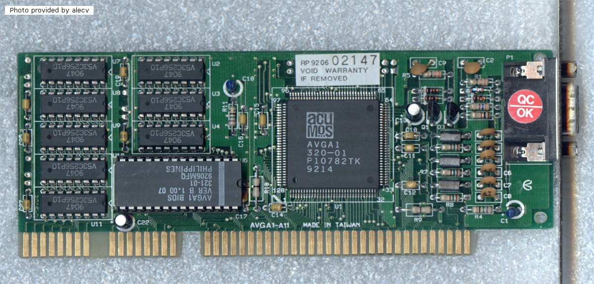 | ??? | AVGA1-A11 | 16-bit VGA card | '90 | B | U5 | BIOS | 44C6DE | [27256] | 32 KB | D | alecv | Download | See note 12. Click here to see the bytes rearrranged. |
