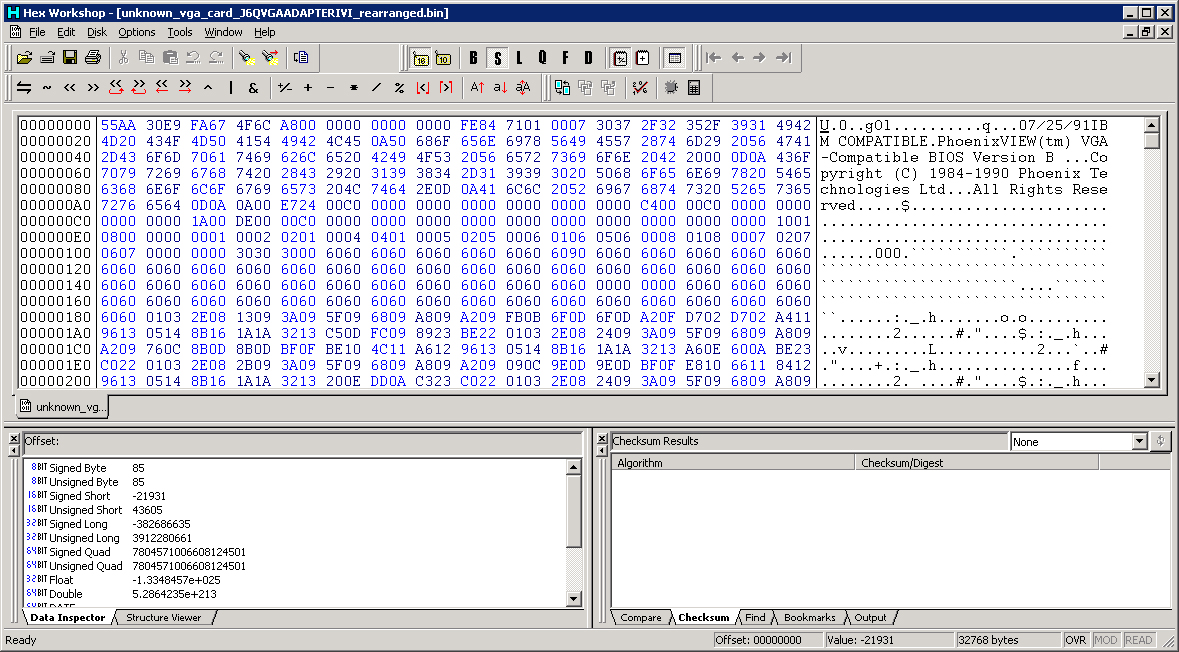 | Note 4 | First two bytes are 55/AA indicating BIOS expansion ROM. Third byte is 0C indicating code size in the 8 KB sized ROM is 6 KB. That explains why the 8-bit checksum of the entire 8 KB is not 00. As expected, the 8-bit checksum of the first 6 KB (addresses 0000h to 17FFh) is 00. |