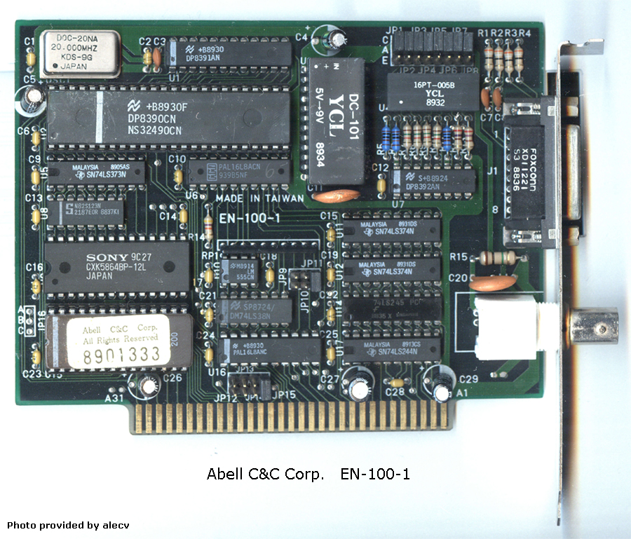 | Abell C&C Corp. | EN-100-1 | 8-bit network card | '89 | V1.2e | U15 | Boot | 17C400 | [2764] | 8 KB | D | alecv | Download | NE-1000 compatible card. IPX boot ROM. |