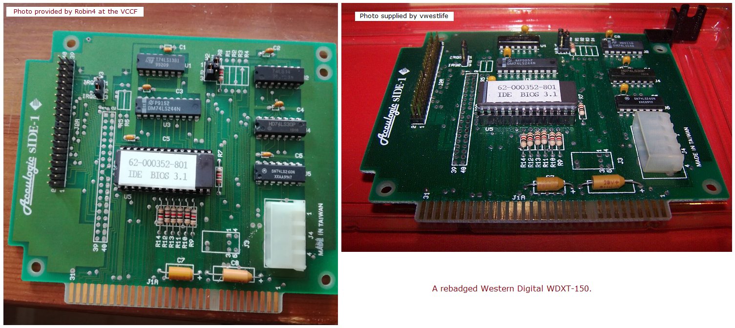 | Acculogic | sIDE-1 | 8-bit IDE-XT controller | '90 | 3.1 | U5 | BIOS | 0B8300 | [2764] | 8 KB | D | Robin4 | Download | Rebadged Western Digital WDXT-150. "62-00352-801 IDE BIOS 3.1" on sticker. BIOS is a Western Digital 'Super BIOS'. |