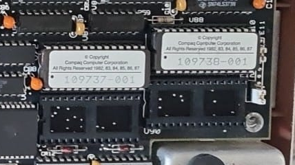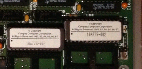 "BIOS 405702-00 A © 1986" on 17A ROM sticker. "490043-00 A © 1987" on 7C ROM sticker. |