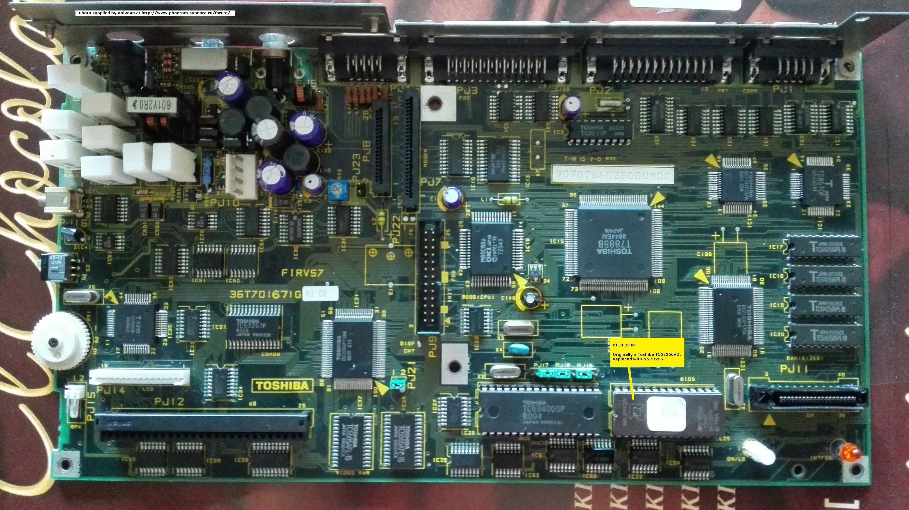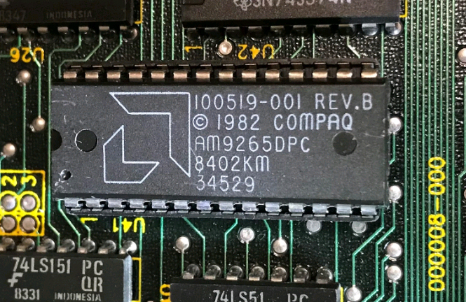 Low ROM. Under ROM, PCB has "27128" on it. (Main chip: Western Digital WD90C00-JK.) High ROM. Under ROM, PCB has "27128" on it. |