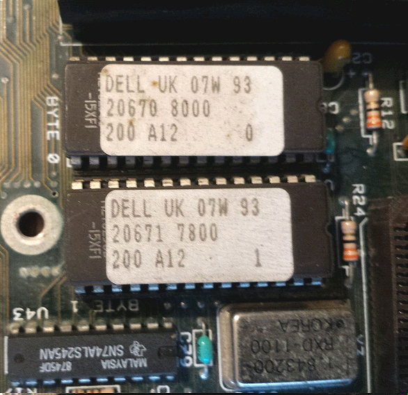 Chip labelled "9515 ROH". HI chip (ODD). [Wang BIOS 03.13.00, based on a Phoenix BIOS] Chip labelled "9514 ROL". LO chip (EVEN). |