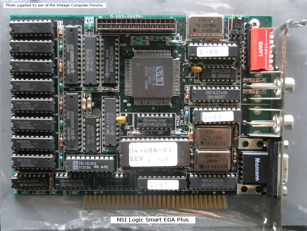 | ??? | ??? | 8-bit EGA card | '85 | 1.6A | U1 | BIOS | 289400 | NM27C256 | 32 KB | D | IdeaFix | Download | Contains "EGA BIOS V1.6a COPYRIGHT Award Software Inc". Main chip is a CITYGATE D10. |