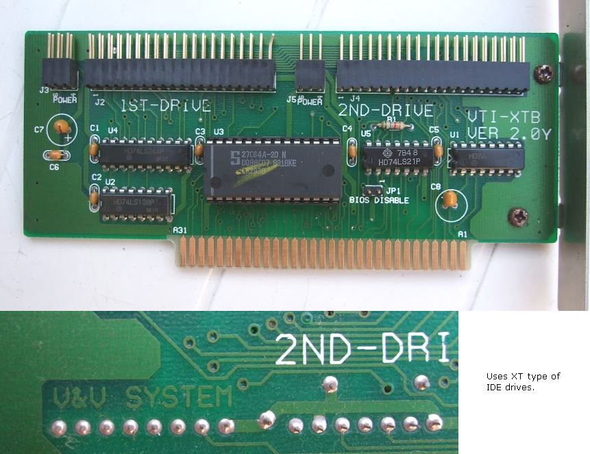 | ??? | VTI-XTB | 8-bit IDE-XT controller | '88 | 1.7 | U3 | BIOS | 166800 | 27C64A-20 | 8 KB | D | SunDown79 | Download | Card possibly made by 'V & V System'. |