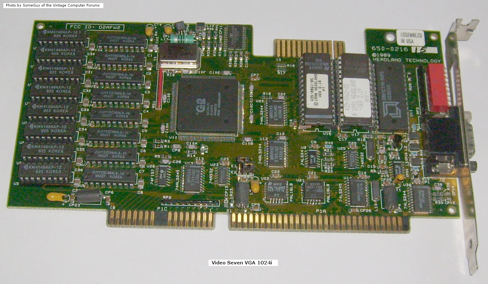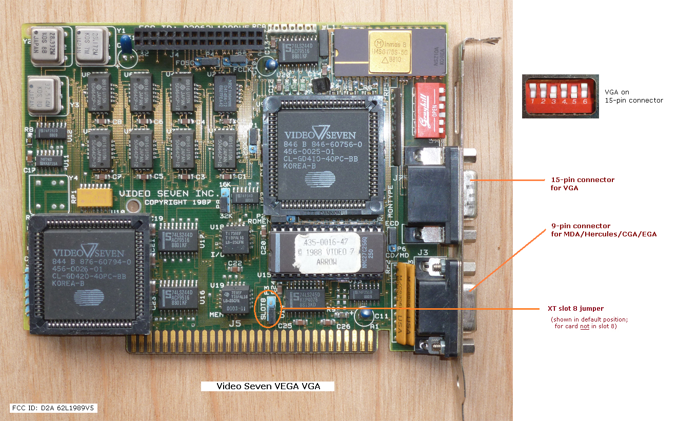 | Video Seven | VEGA VGA | 8-bit VGA card | '88 | 1.47 | U15 | BIOS | 2B8600 | NMC27C256Q-250 | 32 KB | D | modem7 | Download | FCC ID: D2A62L1989V5 / On ROM sticker: "435-0016-47" / Contains "VEGA VGA BIOS Version 1.47" |