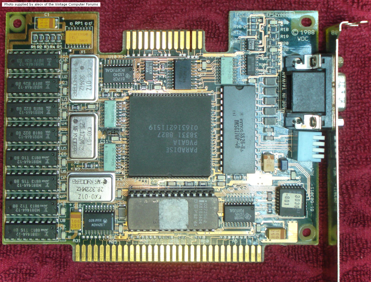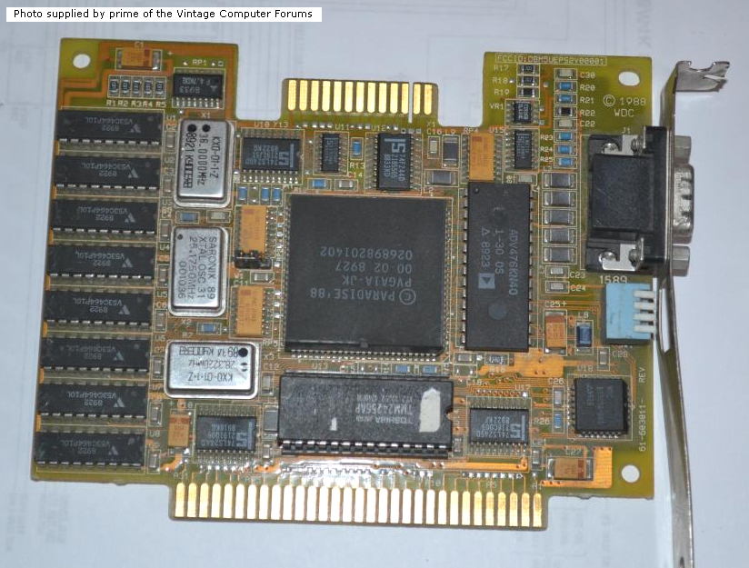 | Western Digital | ??? | 8-bit VGA card | '88 | 3056-002 ? | U14 | BIOS | 25CF00 | [27256] | 32 KB | D | alecv | Download | FCC: DBM5UEPS2V00001 Main chip: PVGA1A |